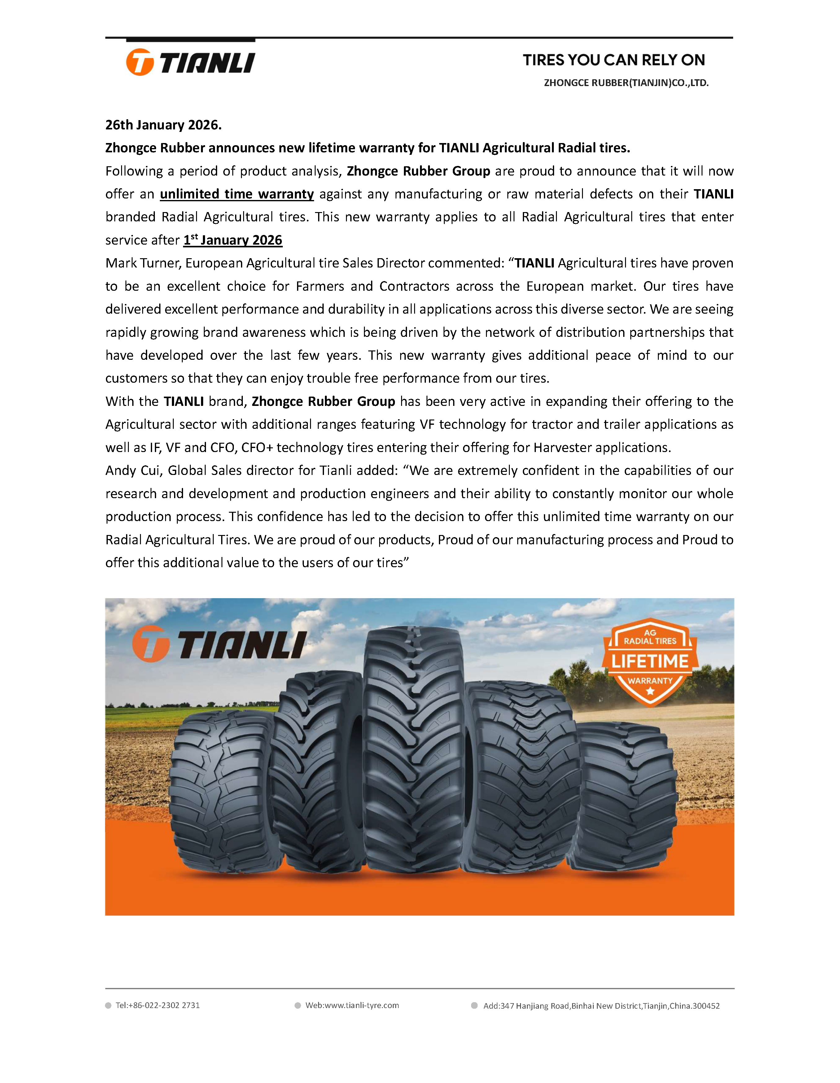 Zhongce Rubber announces new lifetime warranty for TIANLI Agricultural Radial tires.